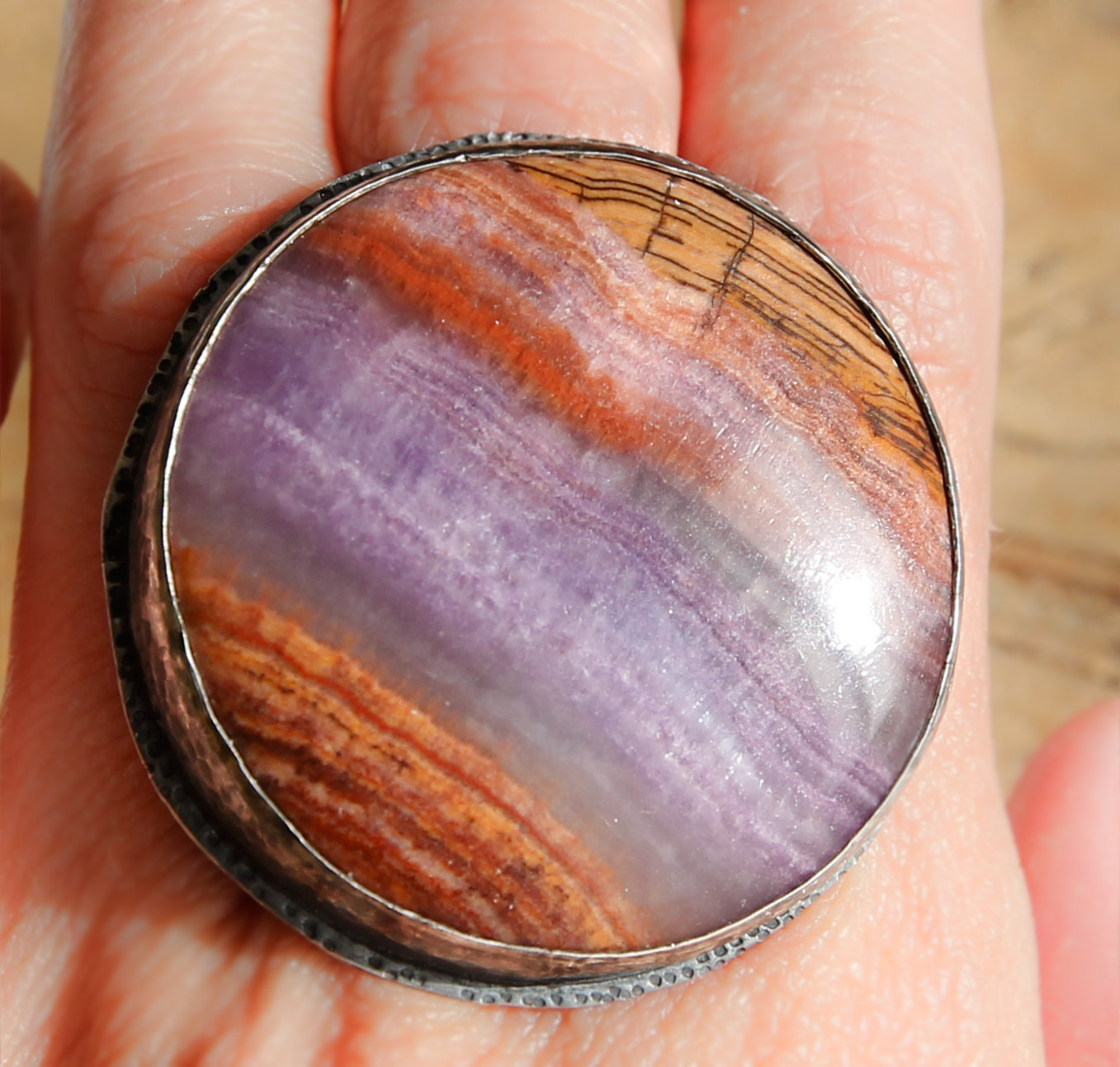 A large Purple Lace Chalcedony and sterling silver ring, handmade by Michaela at Thornbird Studios, Canada.
