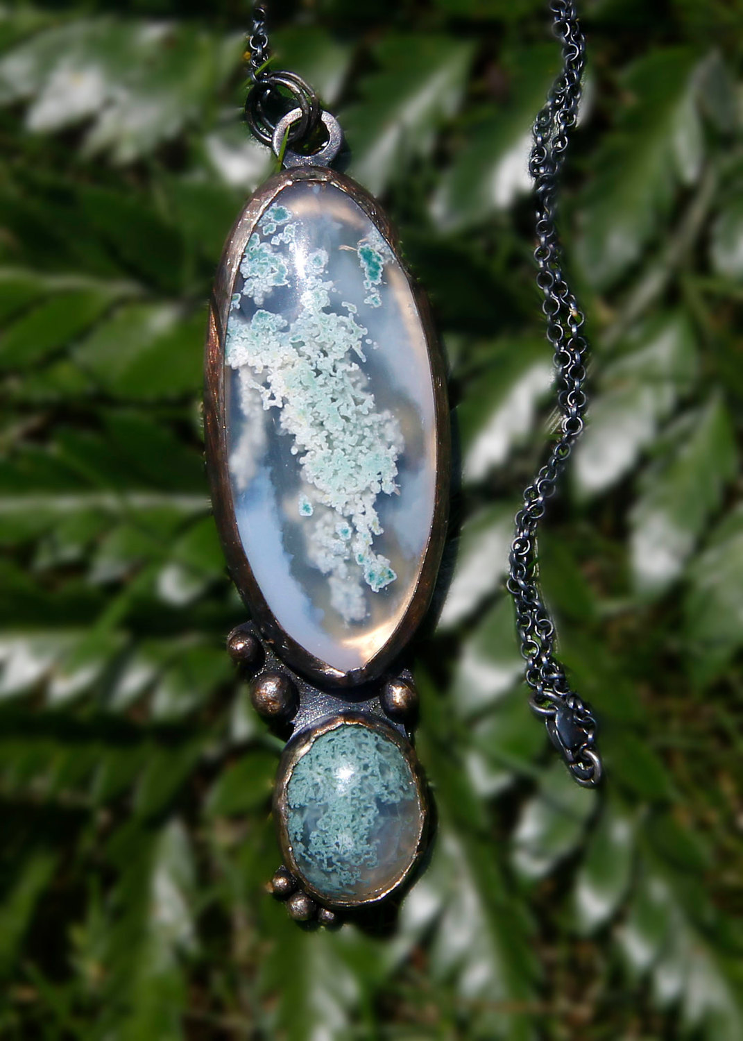 "Will o the Wisp" pendant Moss agate and sterling silver; Hand made and oxidized by Michaela at Thornbird studios ***chain is not included