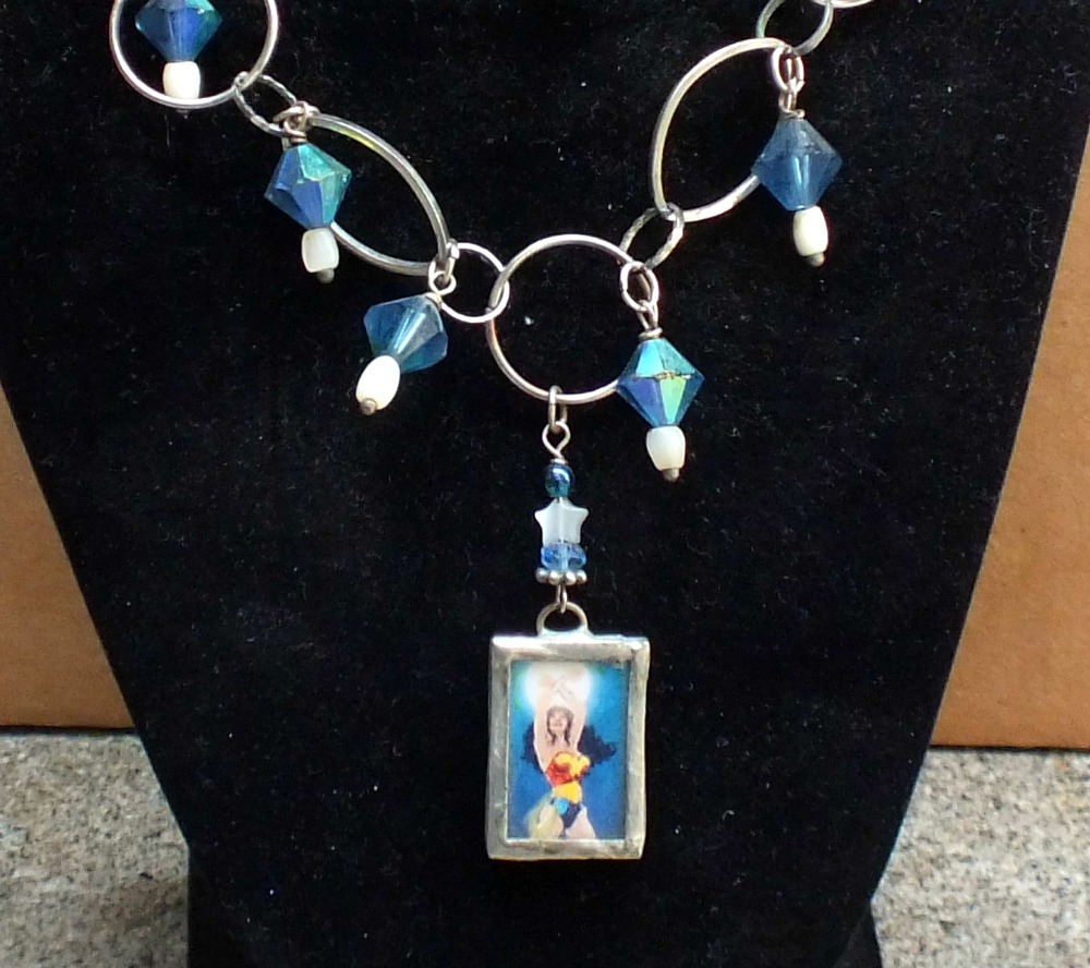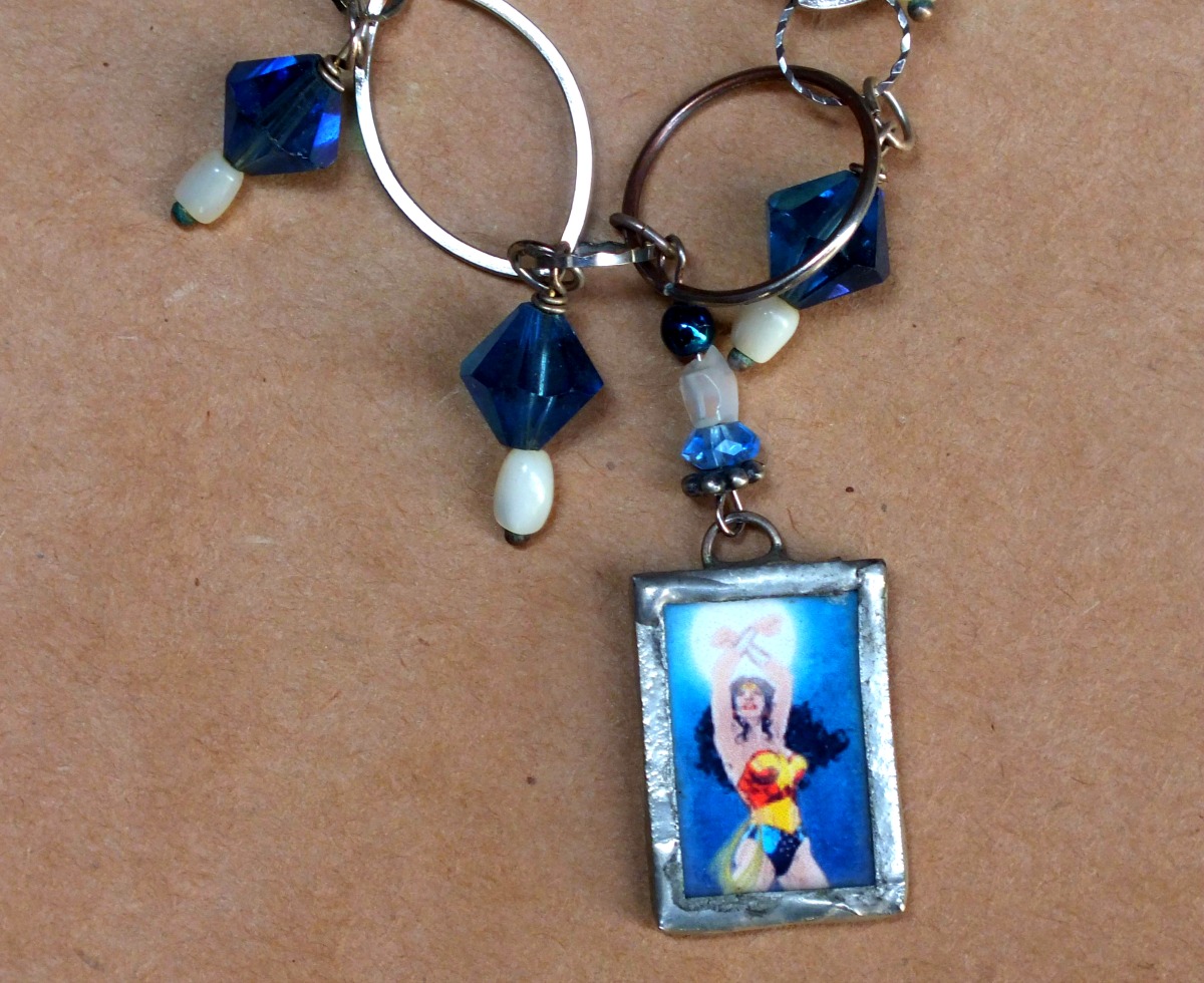 "Wonder Woman;" a whimsical necklace in silver with vintage blue glass beads, finished off with a miniature square amulet featuring Wonder Woman, created by Lisa Benshoof at Bohemian Mystique.