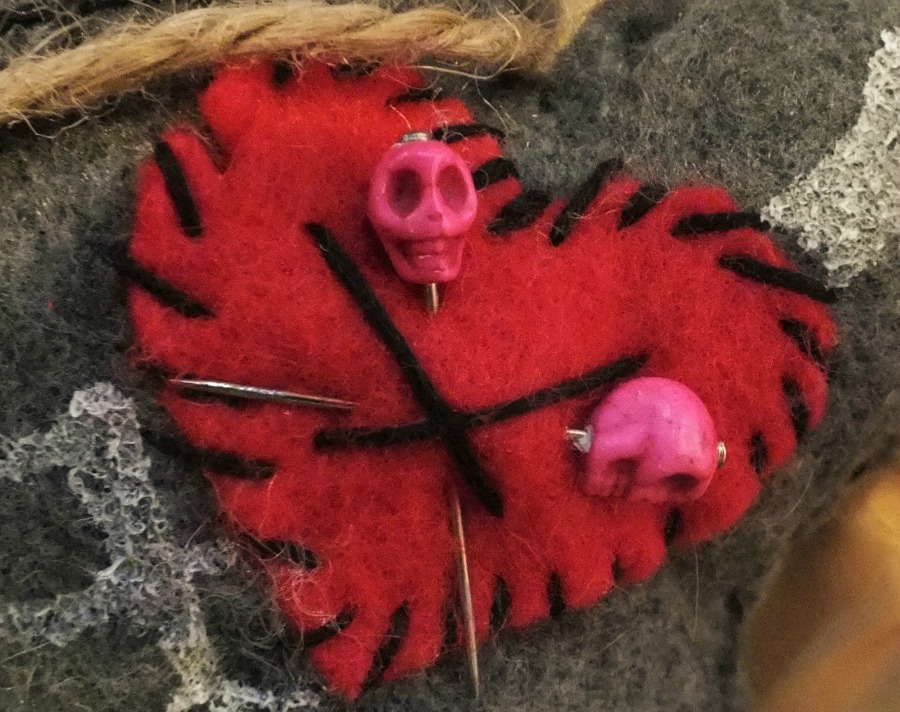 A small hand made and decorated felt Voodoo Doll-- also called "Little Buttheads"-- ornament or hanging created by sculptor and art doll artist Kat Anderson. Unusual and really fun and cute gift item! Carries on Kat Anderson's general theme of Day of the Dead items.