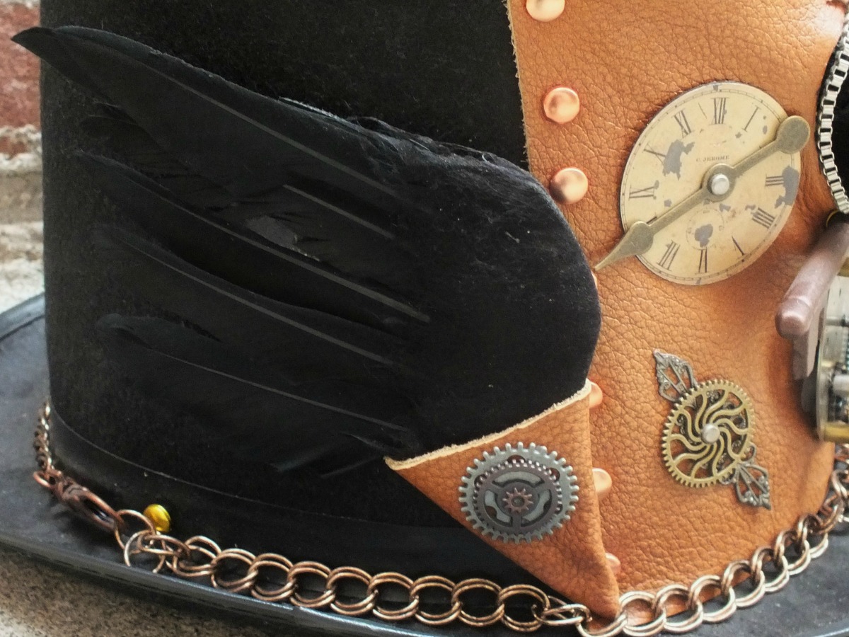 "Clockwork Raven," a spectacular and unique Steampunk inspired hat created by LIsa Benshoof at Bohemian Mystique. Traditional black felt "stovepipe" hat with leather, feathers and other adornments. Wings on each side.