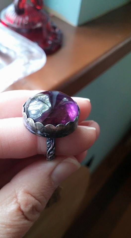 "Violet Flame;" natural amethyst cabochon stone set in a gorgeous hand tooled silver setting.