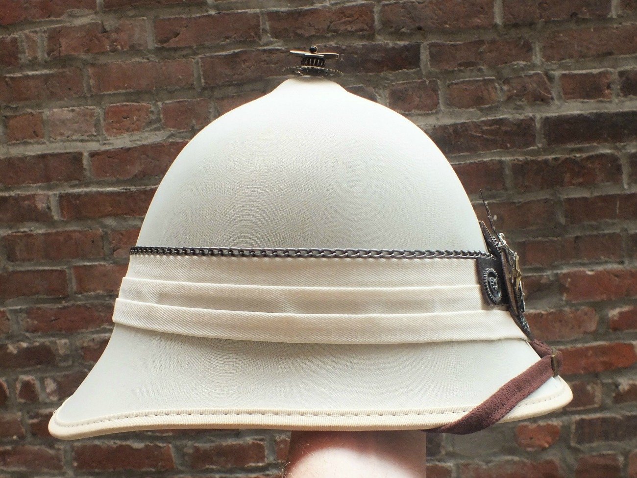 A lightweight version of the traditional British "pith helment." Measures approximately 9" tall x 8" across and 12 1/2" front to back (23cm x 20cm x 32cm).